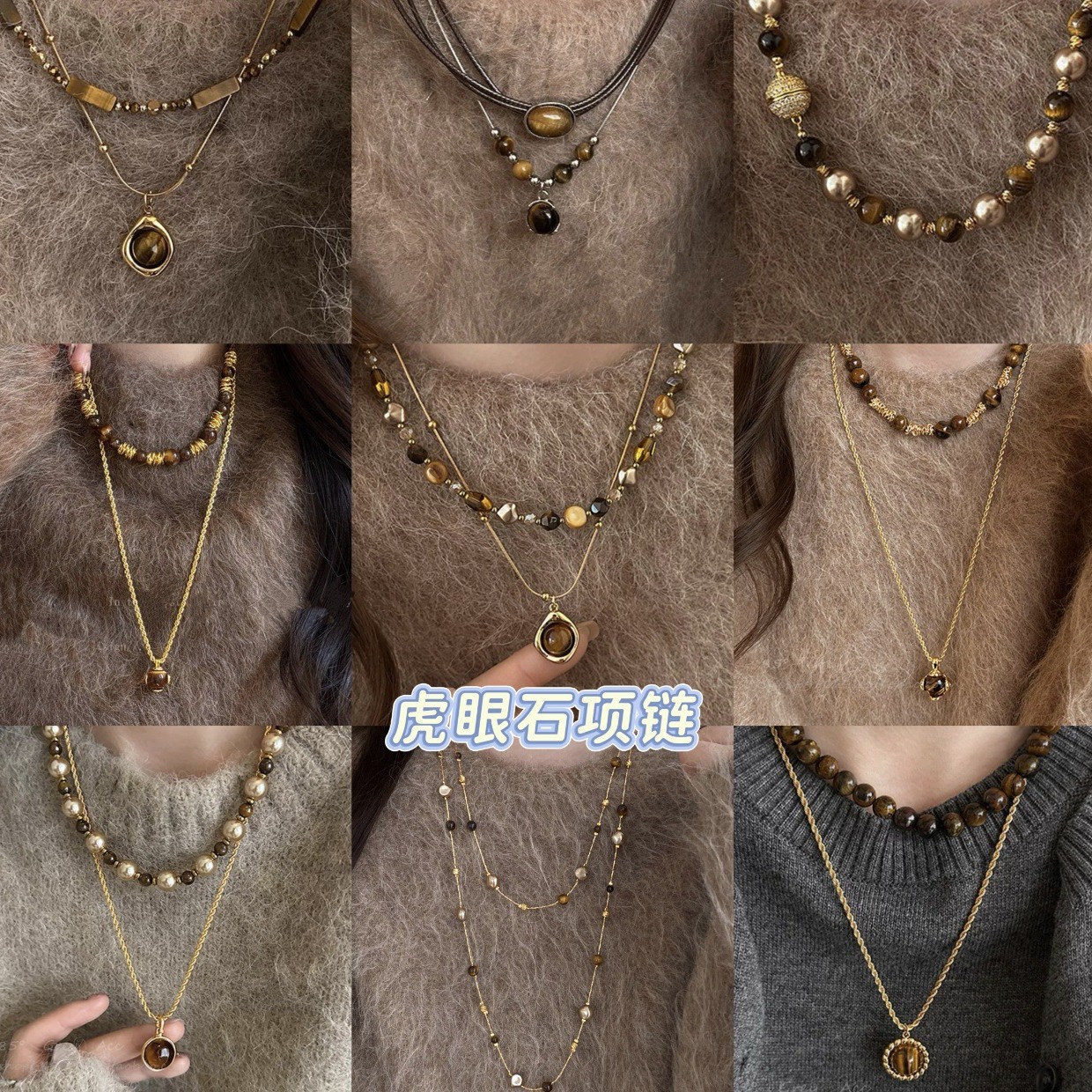 Retro Tiger Eye Stone Geometric Round Pendant Necklace Maillard Style Clavicle Chain Personalized Niche Design Necklace for Women