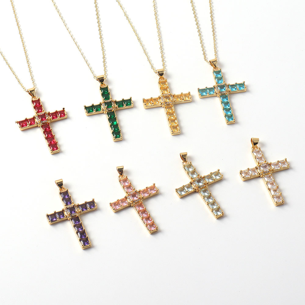 European and American Cross-Border Women's Necklace Sweater Chain Fashion Colorful Crystal Mixed Color 3-Color Religious Cross Exquisite Pendant