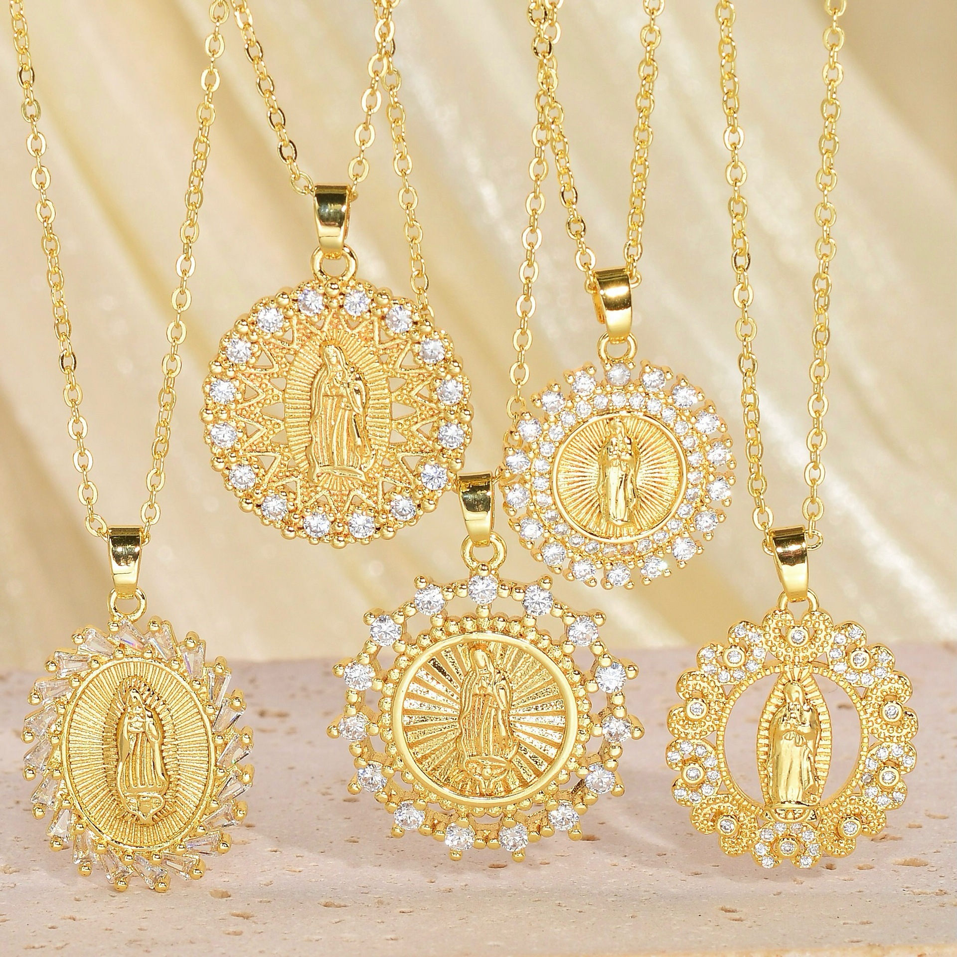 Aogu Cross-Border Supply Classic Religious Jewelry Copper Plated 18K Gold Zircon Virgin Mary Pendant Necklace for Women