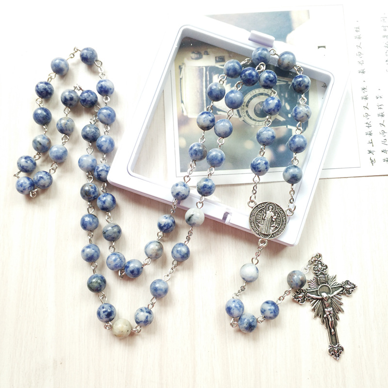 Wholesale factory original simple blue rosary round beads cross rosary necklace long fashion pendant clothing chain