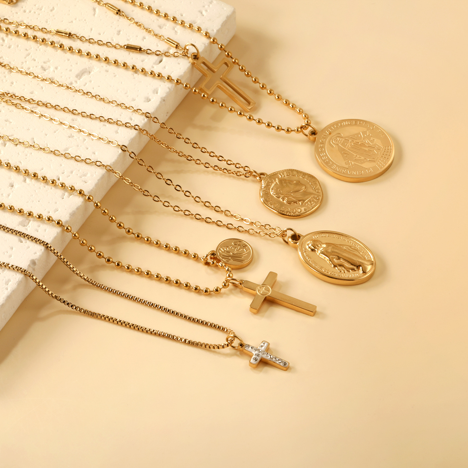 Foreign Trade Necklace Cross Pendant Religious Geometric Necklace Stacked Necklace Electroplated 18K Gold Stainless Steel Jewelry for Women