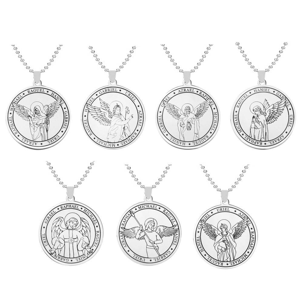 European and American Cross-border Titanium Steel Seven Angels Pendant Religious Necklace Men's Round Brand Angel Wings Medal Necklace