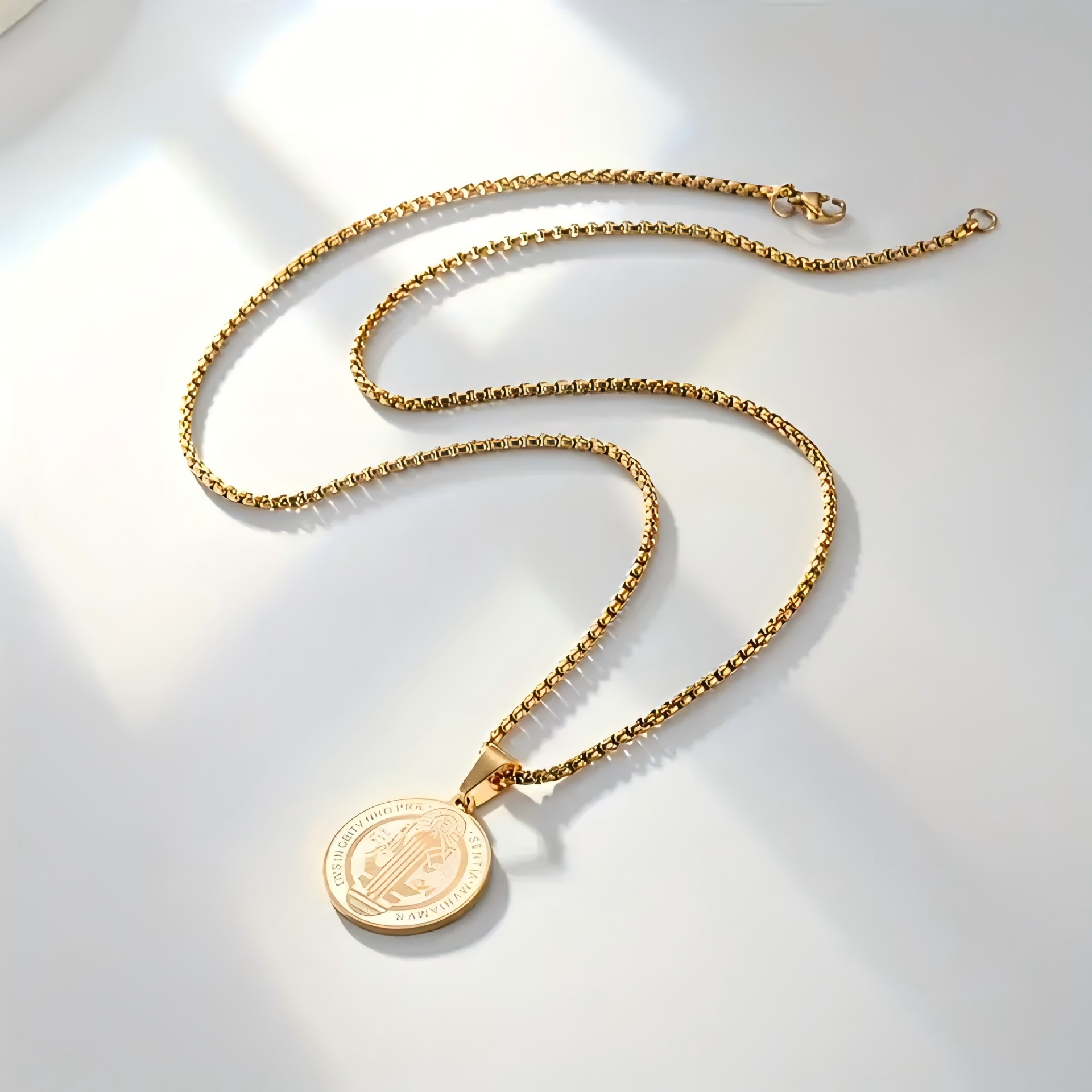 Cross-Border Trendy Cool St. Benedict Medal Stainless Steel Necklace Retro Religious Style Double-Sided Pattern Sweater Chain
