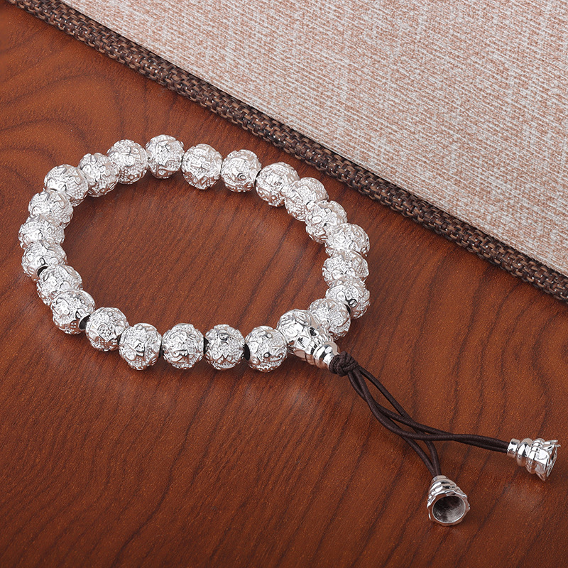 Xizang Six-Character Mantra Bracelet Alloy Silver-Plated Sanskrit Rosary Silver Bracelet Men and Women Retro Buddhist Beads Hand Ornaments