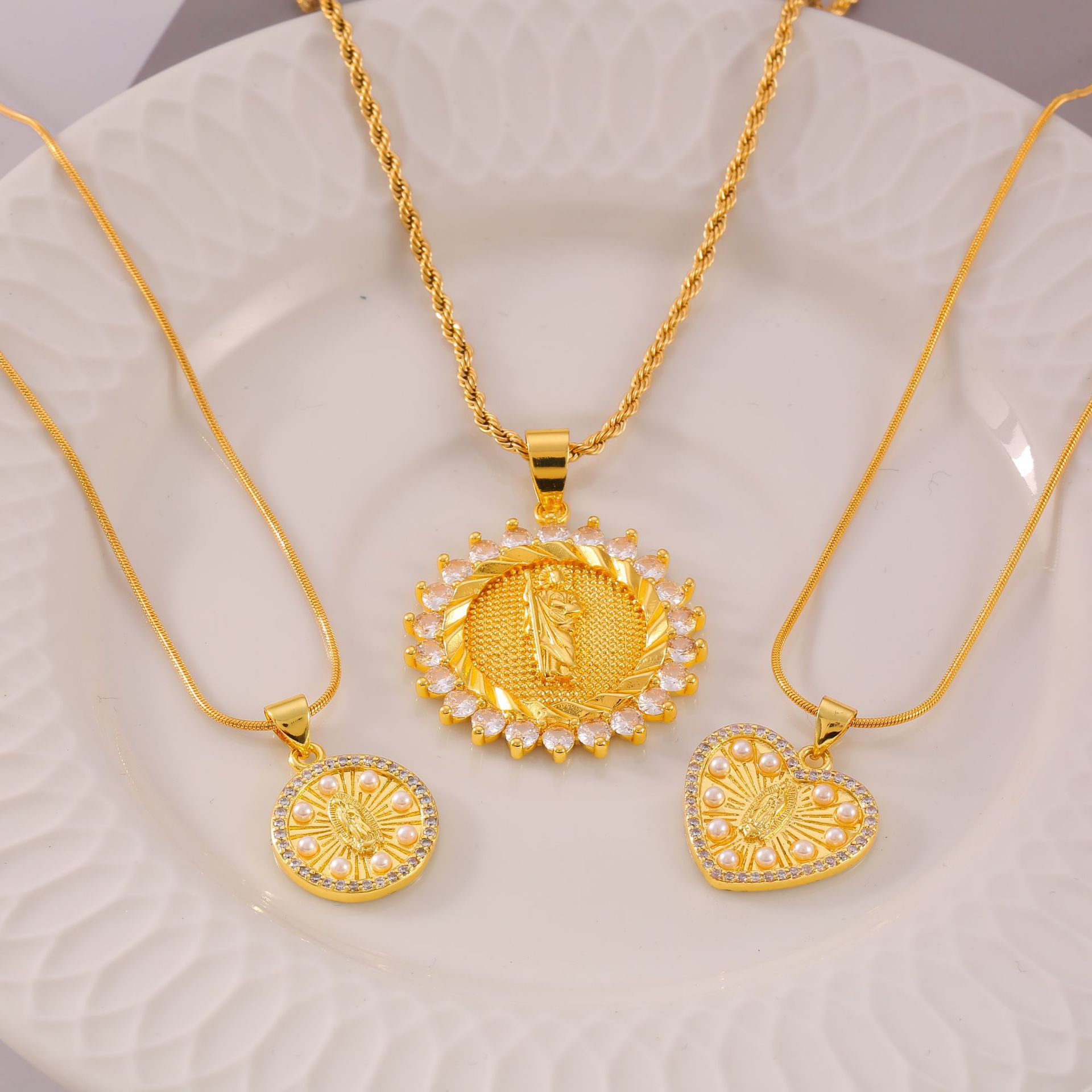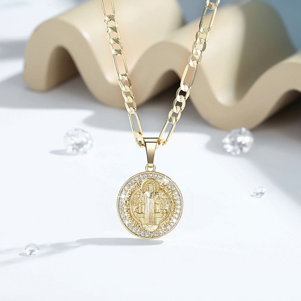 E-Commerce Religious Figurine Clavicle Chain for Women, Copper Plated with 14K Gold, Light Luxury Zircon Geometric Round Pendant Necklace for Women