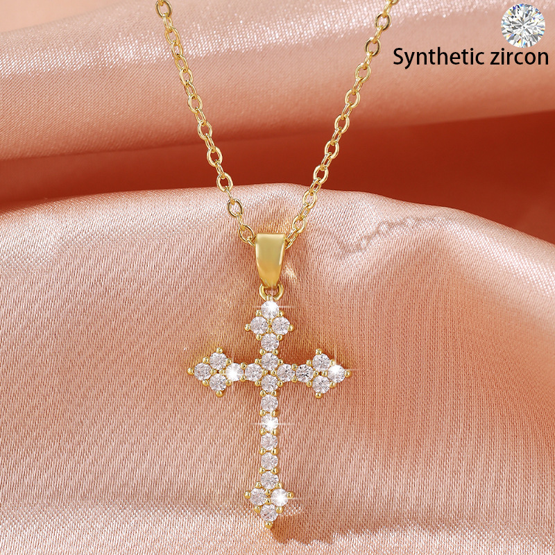 Aliexpress Cross-Border Stainless Steel Micro-Inlaid 18K Gold-Plated Pendant Cross Necklace Religious Women's O-Chain Wholesale
