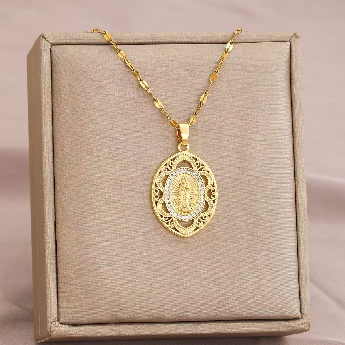 European and American Fashion Religious Catholic Virgin Mary Pendant Necklace Copper Micro-Paved Diamond Cut Out Carved Women's Jewelry Accessories