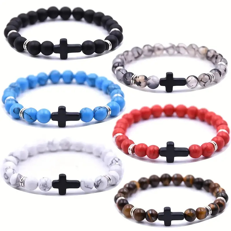 Cross-border Explosions 8mm Natural Stone Tiger Eye White Pine Frosted Beads Black Cross Elastic Bracelet Men's and Women's Bracelets