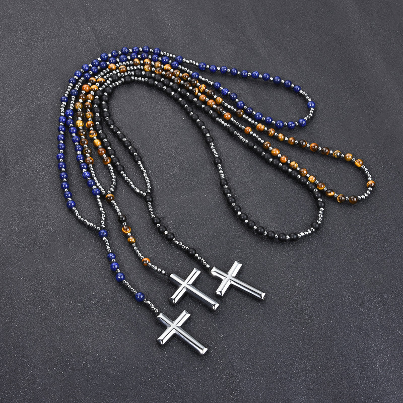 New Cross Pendant Tiger Eyes Green Gold Matte Agate Imitation Hematite Religious Necklace Long Chain European and American Hip Hop Style