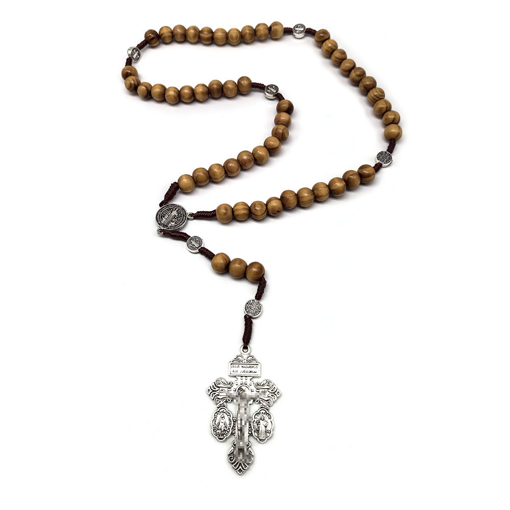 Cross-Border Wholesale Retro St. Benedict Wooden Bead Rosary Pendant Jewelry Alloy Cross Braided Pendant Necklace