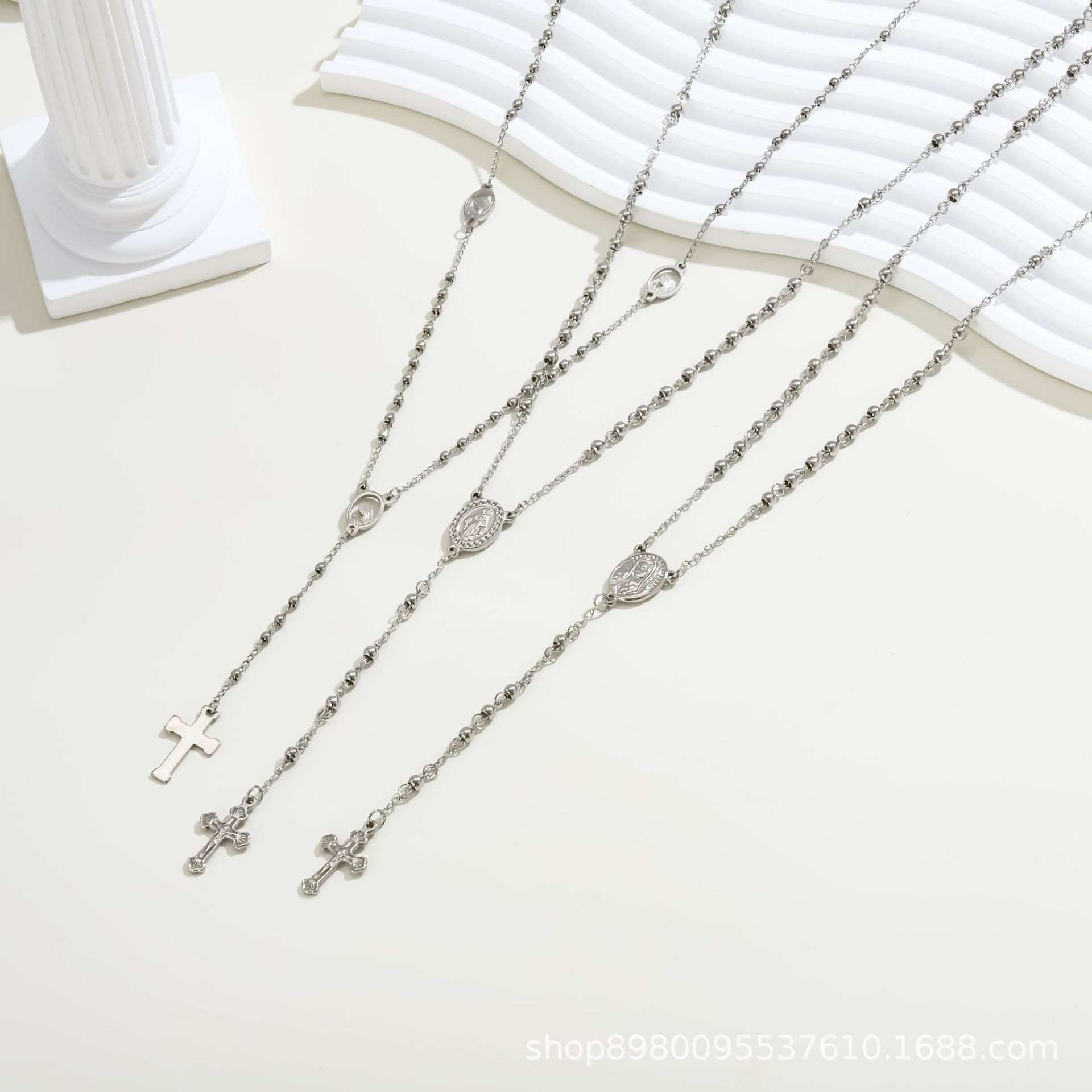 European and American Cross-Border Stainless Steel Religious Rosary Cross Necklace, Steel Color Titanium Steel, Exquisite, Fashionable, Artistic, Retro