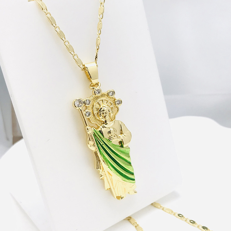 New Cross-border Retro Simple Copper Gold Plated Zircon Emerald Religious Figure St. Jude Pendant Necklace Wholesale