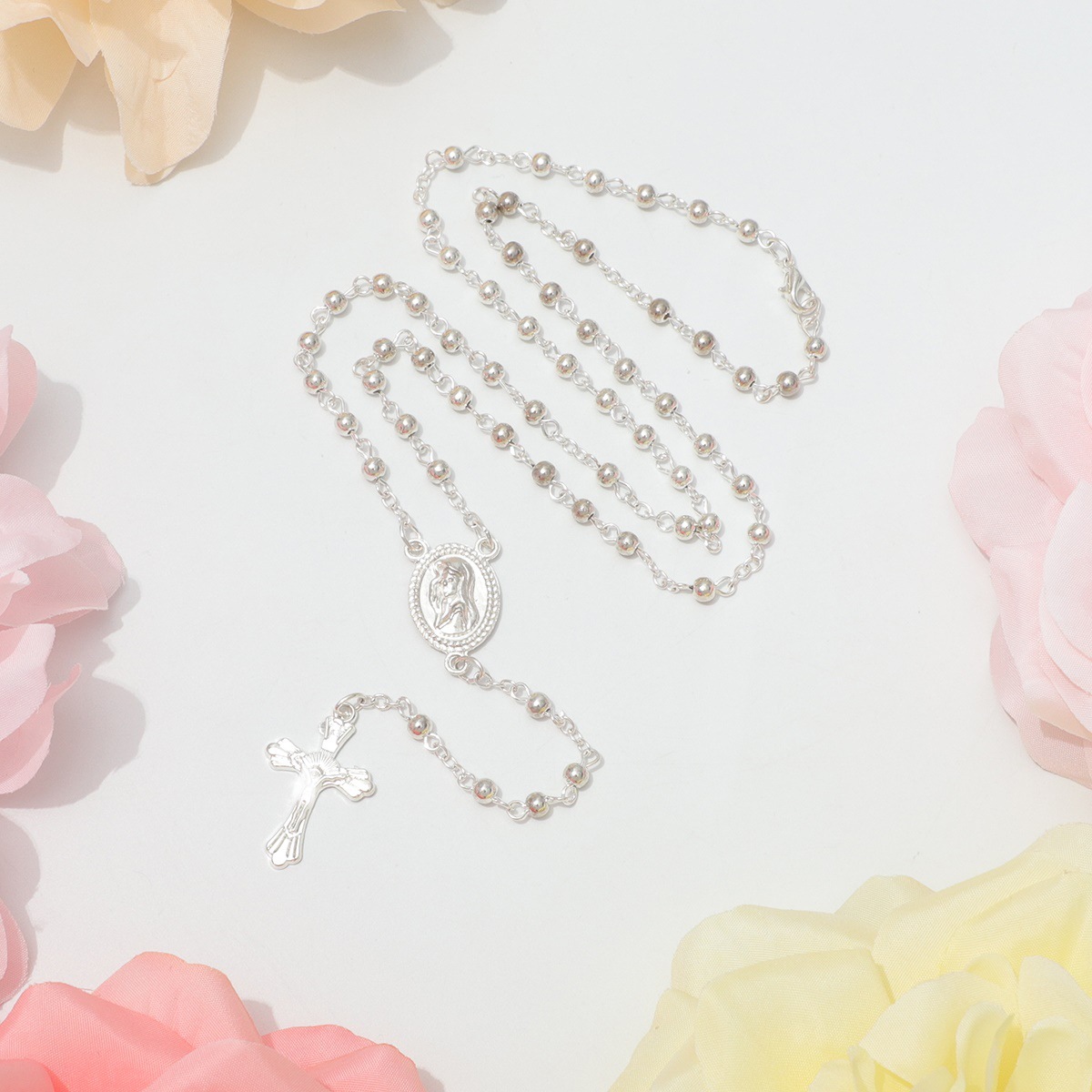 Cross-Border Amazon Simple Silver Beads Hand-Beaded Baptism Rosary Religious Cross Necklace Alloy Pendant Ready Stock