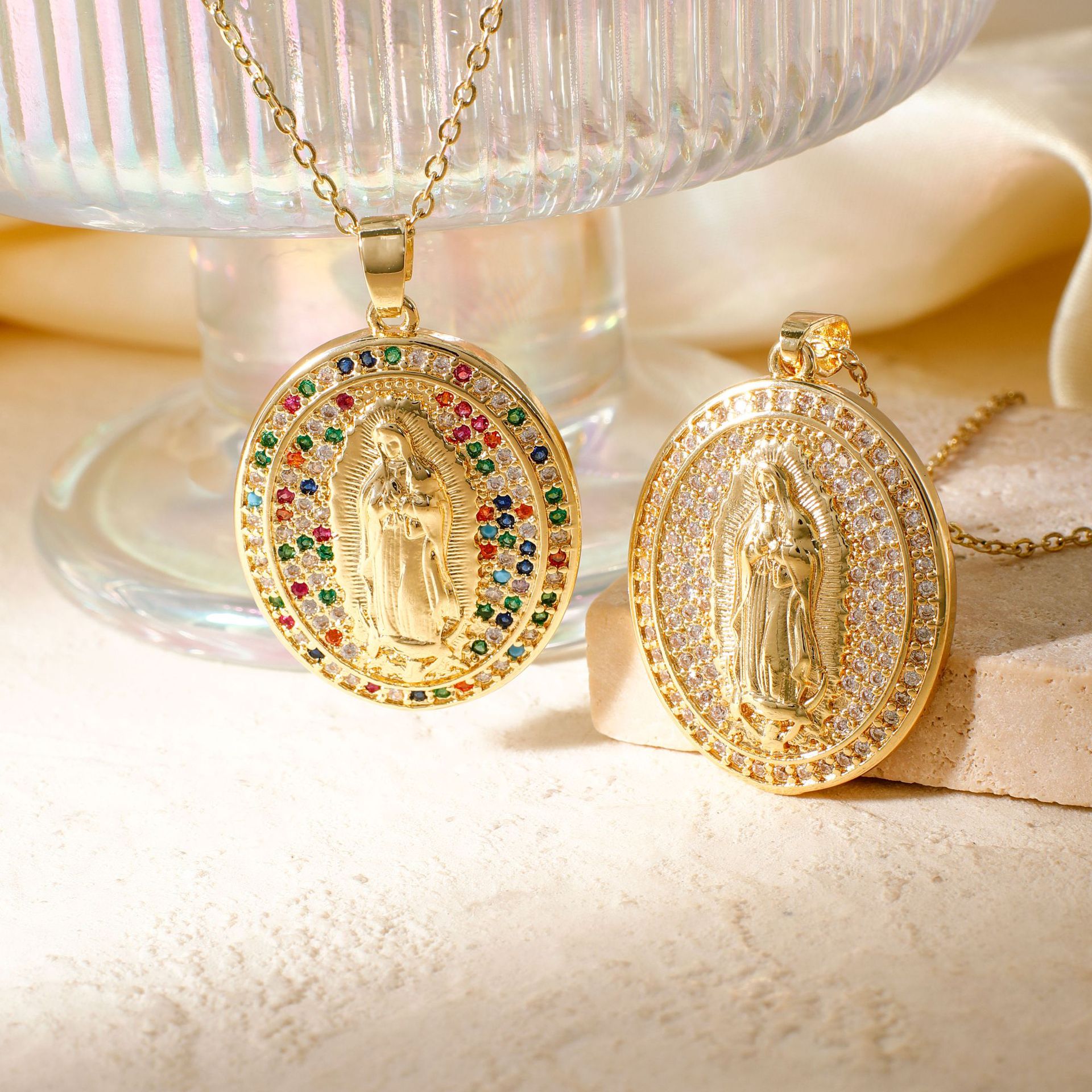 European and American Fashion Religious Copper Emblem with Colorful Zircon Pendant Women's Jewelry Virgin Mary Necklace Versatile