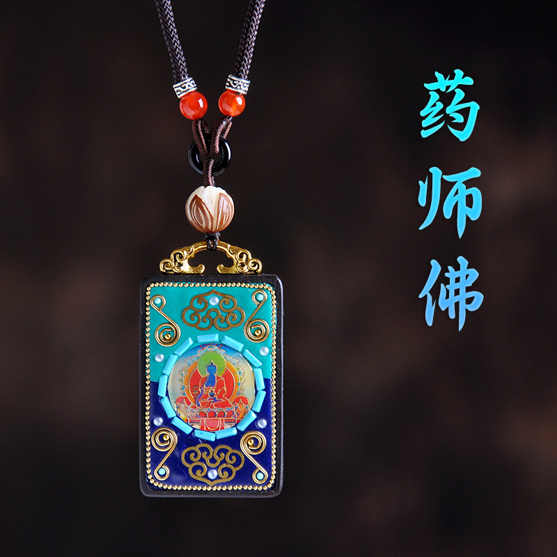 Medicine Master Buddha Sandalwood Thangka Brand Pendant Men's and Women's Necklace Amulet Ping An Buddha Seeking Health Buddha Brand Inlaid Pendant