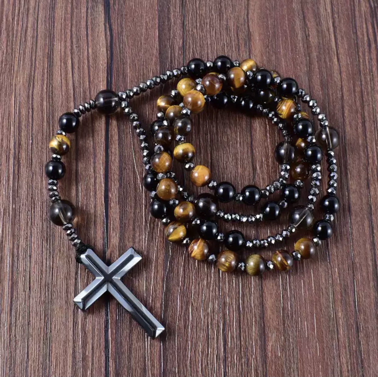 Sweater chain European and American religious cross pendant natural stone Black Stone new long chain cross-border jewelry new fashion