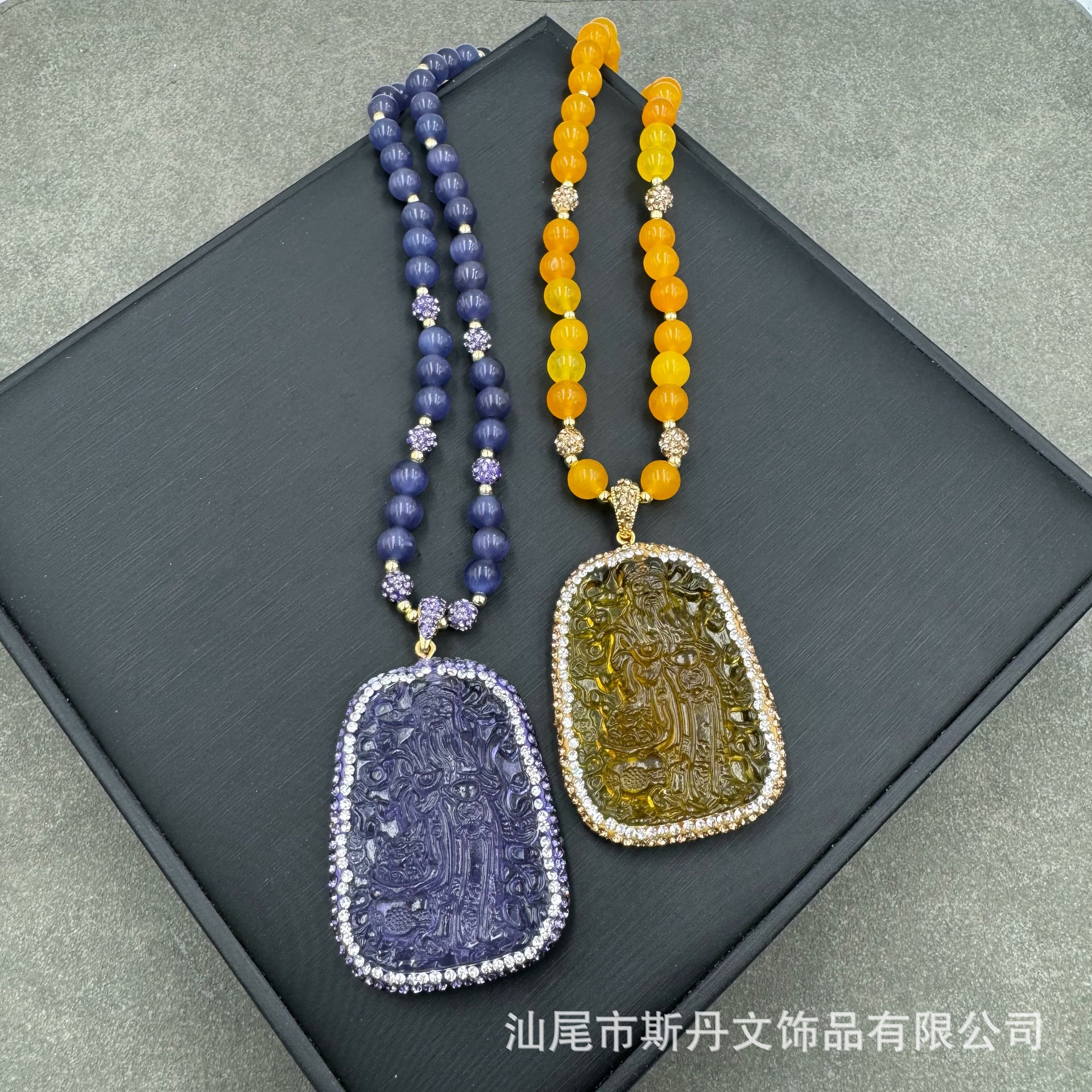 New colored glaze god of wealth Buddha card fortune necklace personality original design retro Czech diamond sweater chain wholesale