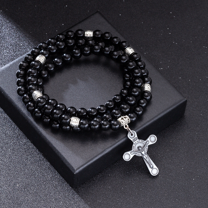 Foreign Trade Jewelry Amazon Men's Black Beads 8mm Round Beads Cross Necklace Religious Long Chain Sweater Chain Cross-Border Batch