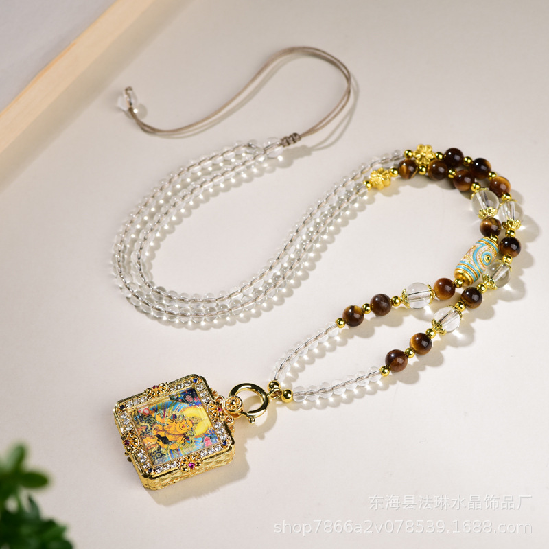 Natural Tiger Eye Stone Necklace Rope Yellow God of Wealth Xizang Thangka Buddha Amulet Crystal Bead Chain Universal Buckle Pendant Necklace