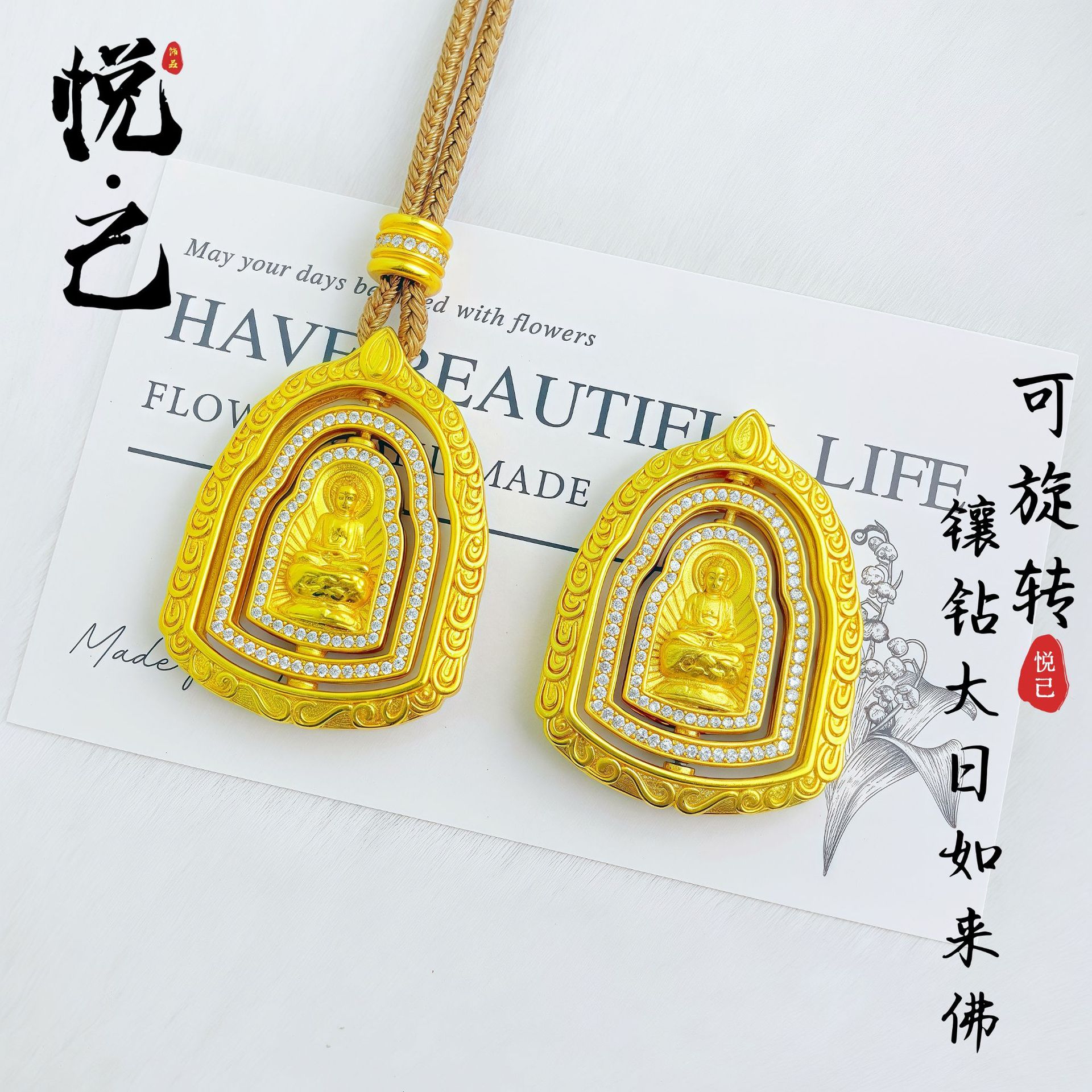 Wholesale of Gold-Plated Copper Pendant with Ancient Gold Inlay and Diamond, Rotating Buddha Amulet, and Fortune Bead Necklace from the Same Style as Used in Gold Stores