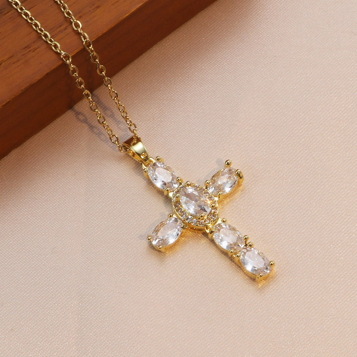 European and American Simple Light Luxury Six Oval Micro-inlaid Zircon Religious Cross Pendant Retro Fashion All-match Clavicle Chain