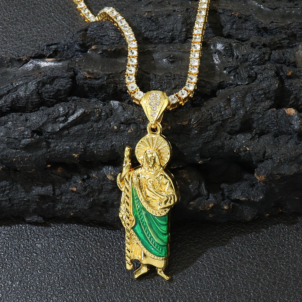 European and American New Hip-Hop Trendy Men's Oil-Dropping Religious Saint Jude Pendant Tennis Chain Necklace Pendant Saint Jude Single Rai Diamond Clavicle Chain