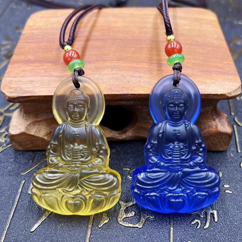 Glass Three-Dimensional Medicine Buddha Pendant, Round Bead Chain, Blue Birth Buddha Pendant, Male and Female Buddha Necklace