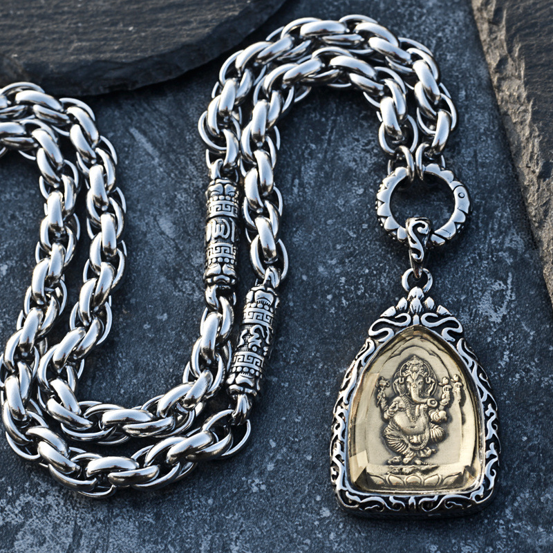 Zhang Zidan Style Buddha Amulet Necklace for Men, Thai Bold Trendy Internet Celebrity Two-Link Three-Link Titanium Steel Elephant Trunk Hip-Hop
