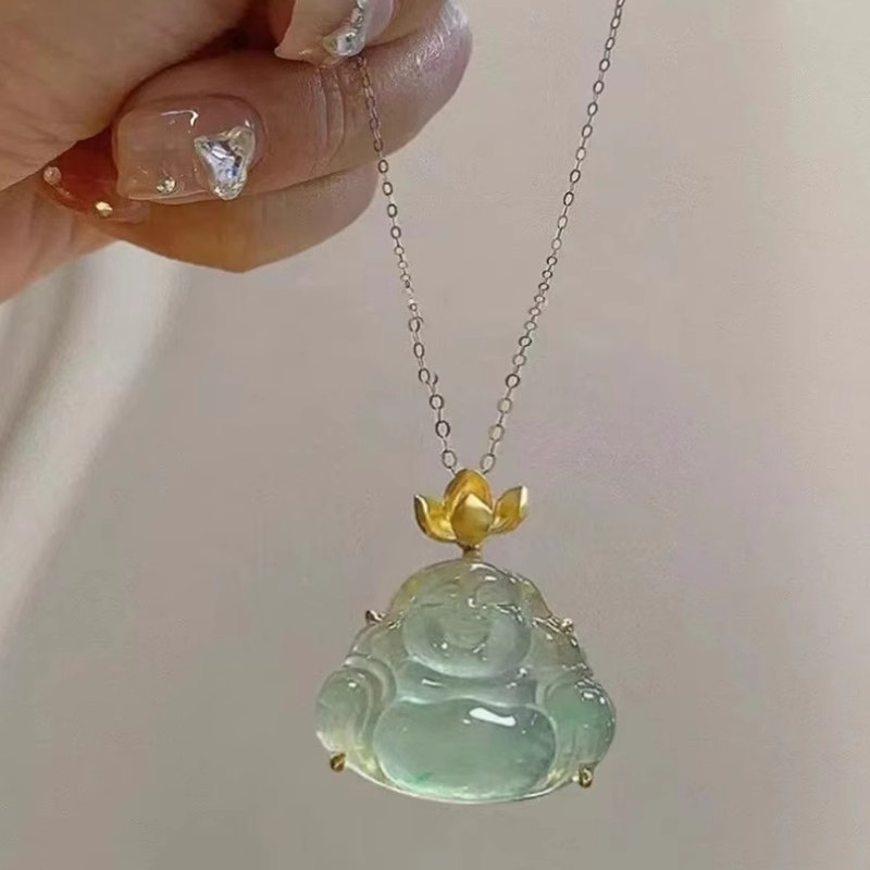 Vintage Chalcedony Orchid Maitreya Buddha Pendant Necklace for Women, New Chinese Style Buddha Amulet Necklace Clavicle Chain Accessory