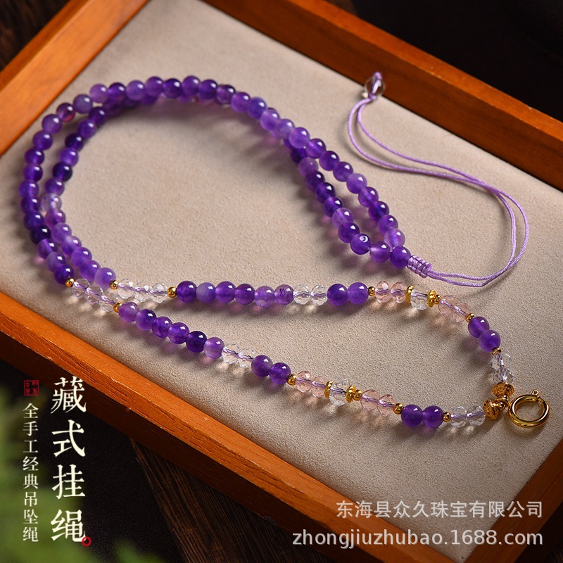 Natural Purple Chalcedony Handmade Beaded Necklace Rope Buddha Card Thangka Pendant Rope Hanging Neck Bead Chain Women's Versatile Sweater Chain