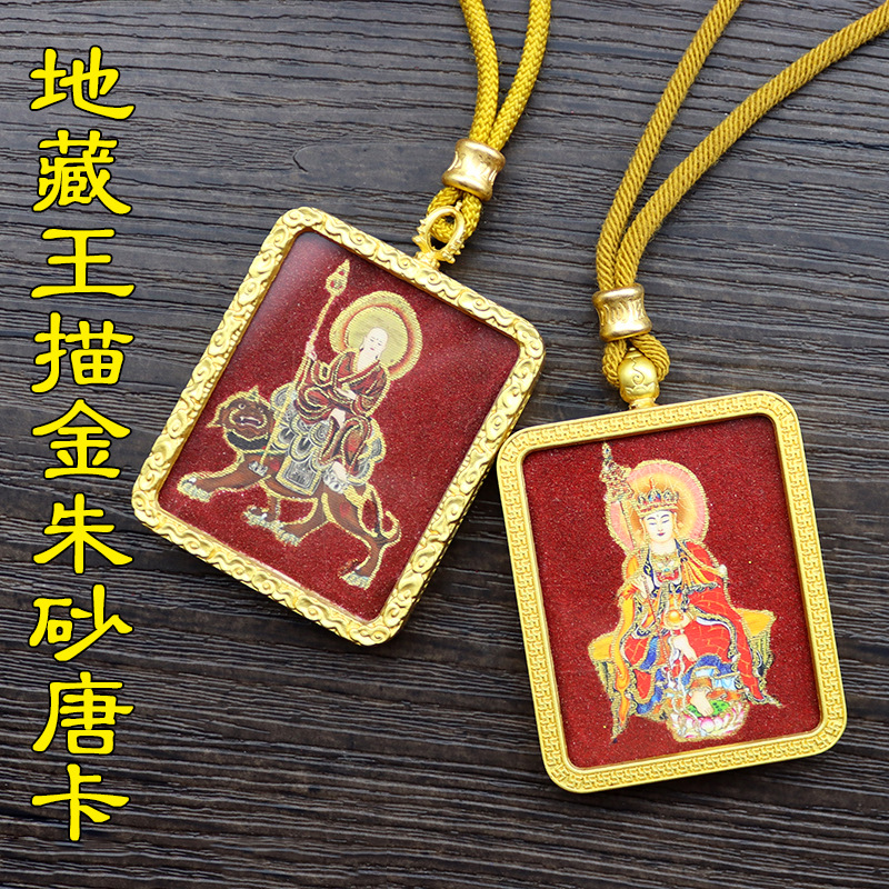 Hand-Painted Gold-Clothed Cinnabar Thangka Jiuhua Mountain Ksitigarbha Bodhisattva Patron Saint Thangka Pendant Necklace Portable Buddha Amulet