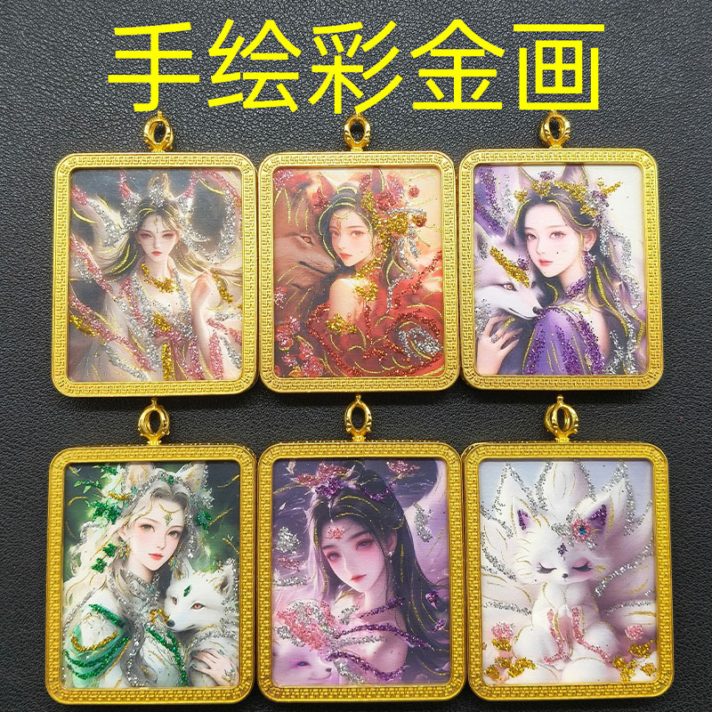 Xizang Style Ga Box Hand-Painted Colored Gold Sand Painting Core Thangka Nine-Tailed Fox Fairy Pendant Necklace Travel Commemorative Buddha Amulet Wholesale