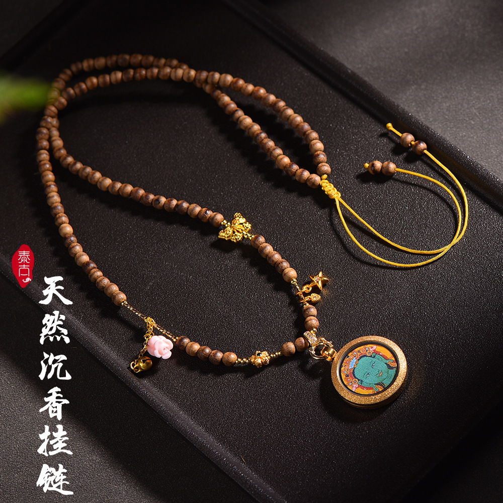 Natural Agarwood Necklace Buddha Amulet Chain Thangka Pendant Rope Adjustable Sweater Chain Crystal Beeswax Gold Hanging Chain