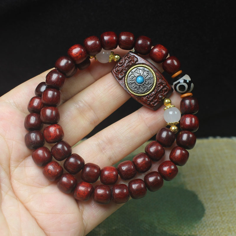 Green Sandalwood Blood Sandalwood Old Bead Double Circle Six-character Square Bracelet National Style Tianzhu Buddha Bead Rosary Jewelry