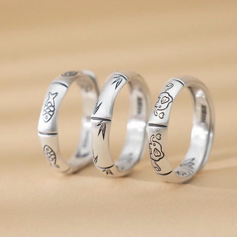 Copper Silver-Plated Retro Ring Sterling Silver Men's and Women's Literary Bamboo Auspicious Elephant Small Fish Open Ring National Style New Chinoiserie
