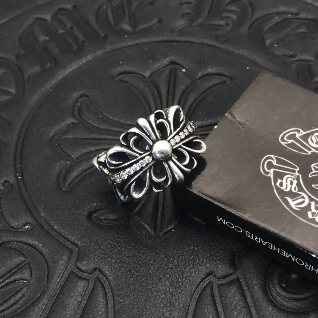 Trendy Jewelry Ring Advanced Diamond-Encrusted Old Open Cross Flower Thai Silver Retro Ring Non-Fading Men's Second-Hand