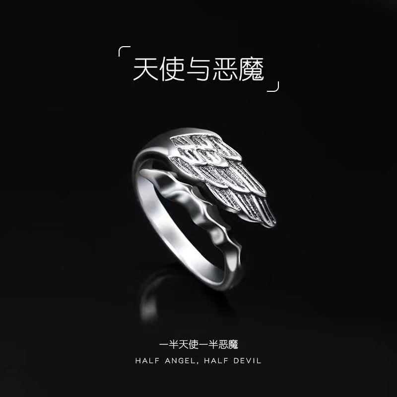 New Angel and Devil Men's Single Ring Personalized Trendy Open Ring Retro Anti-Thai Silver Wings Ring