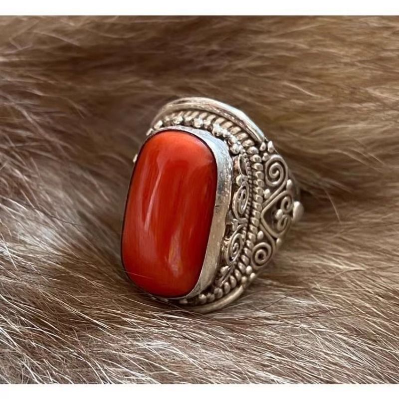 Xizang Mongolian Ethnic Elements Simulation Coral Ring Women's Ring Opening Index Finger Ring Men's Retro Simulation Gem