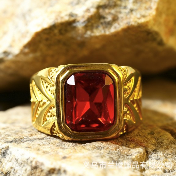 Cross-Border Hot Selling Retro Baroque Style Gold Ring with Ruby Inlaid Personalized Carved European and American Men's Ring Customization