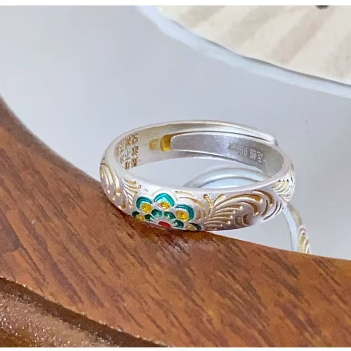 2025 New White Copper Silver-Plated Fortune Ring Enamel Ring with Floral and Arabesque Chinese Style Ring for Men and Women