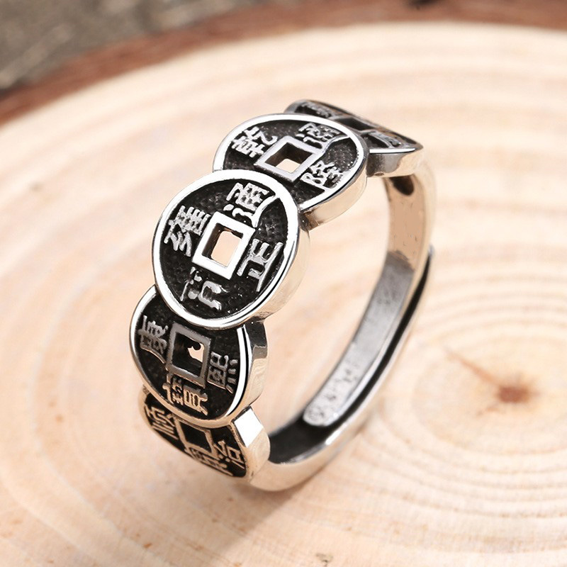 Retro Thai Silver Stylish and Elegant Five Emperors Copper Coin Ring for Men and Women, Literary Style, Fashionable and Simple Ring
