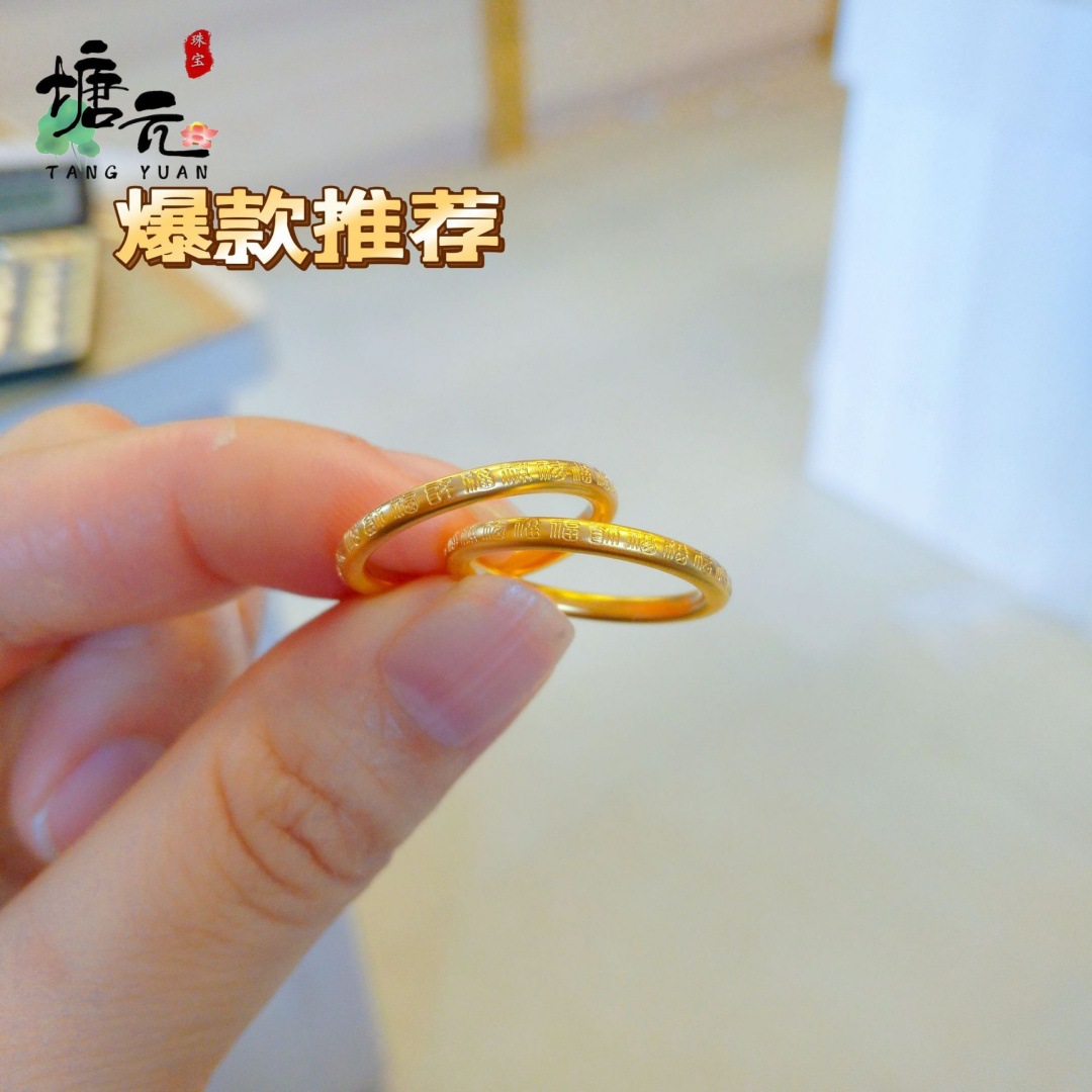 Gold Store Same Style Sand Gold 2mm Plain Ring Yellow Gold Unisex Couple Rings Chinese Style Retro Jewelry with "Fu" Character
