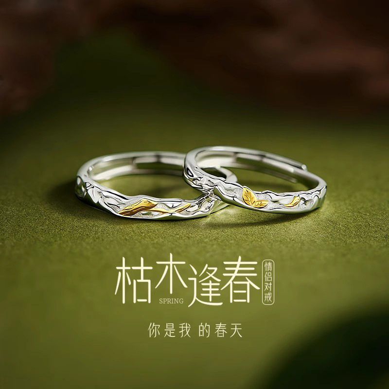 Dead Wood Spring S925 Sterling Silver Couple Ring Men's and Women's Open Leaf Ring a Pair of Accessible Luxury Style Couple Rings