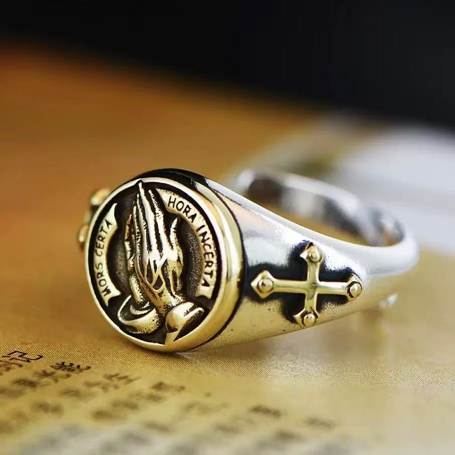 European and American Retro Praying Hands Cross Ring Men's Stylish Trendyy Street Round Brand Niche Design Adjustable Ring