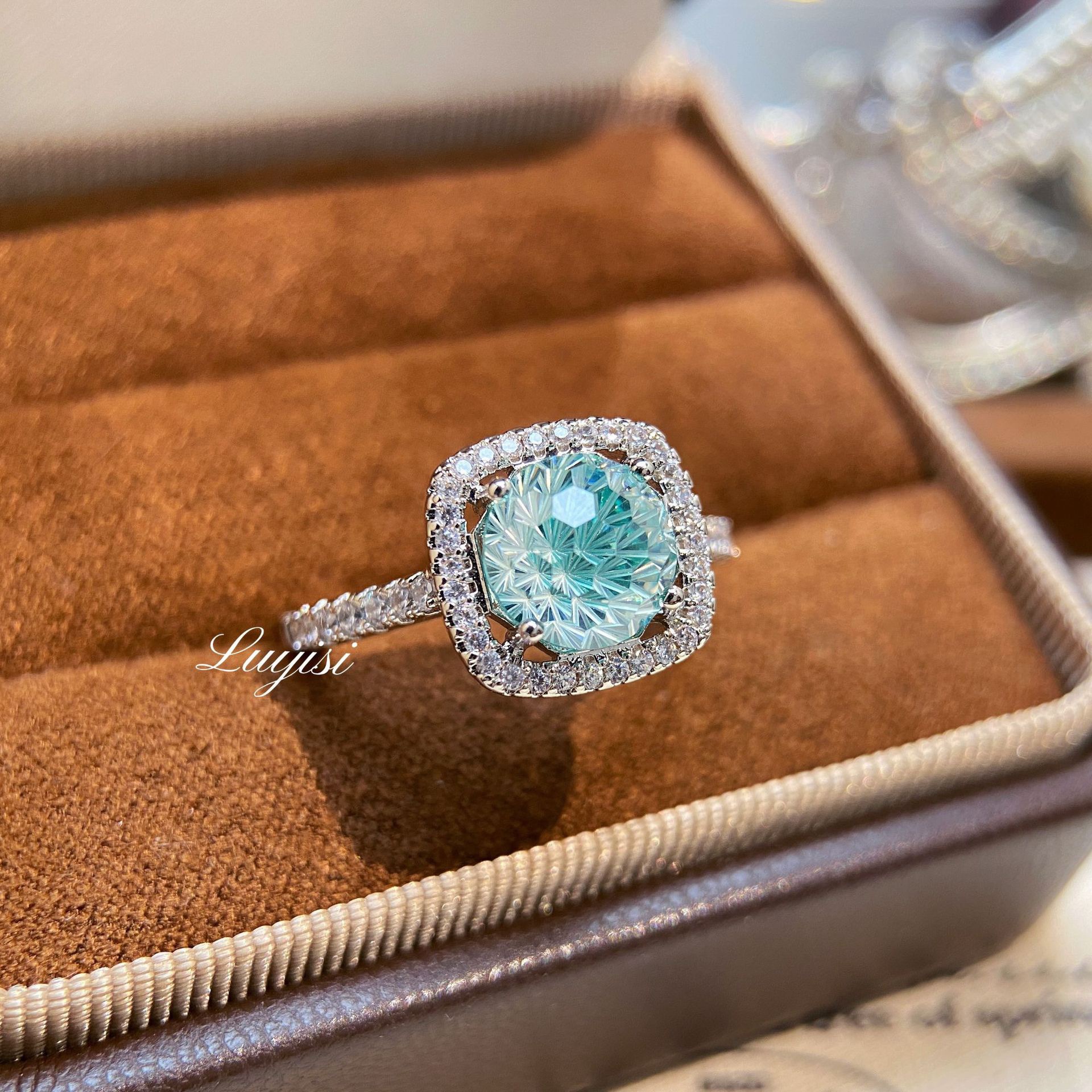 Light Luxury Sparkling Paraiba Fireworks Cut Princess Bag Ring for Women Inlaid with High Carbon Diamonds and Pavé Aquamarine Diamond Ring