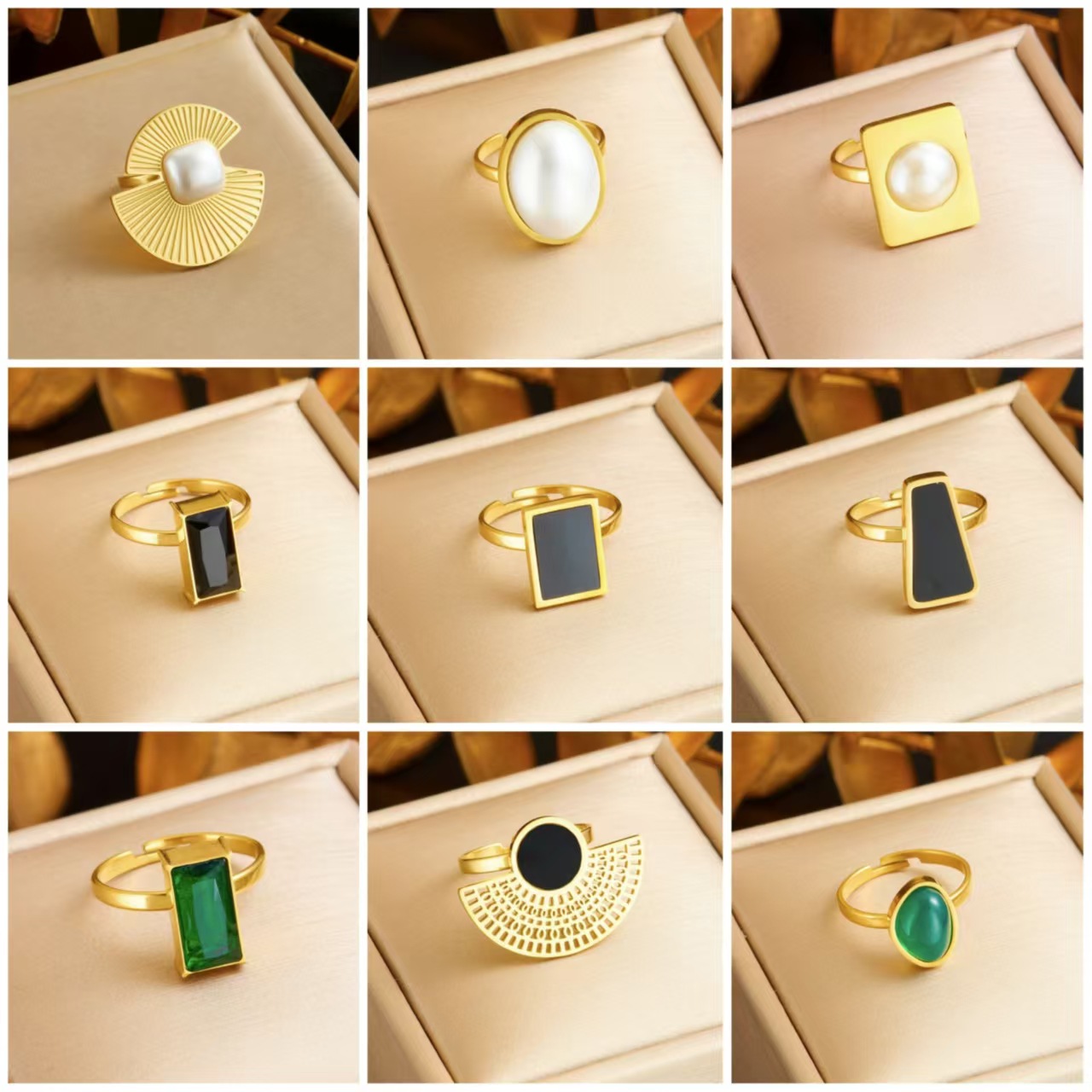 Fashionable Simple Black Square Opening Adjustable Retro Temperament Stainless Steel Gold-plated Jewelry Ring All-match Girls