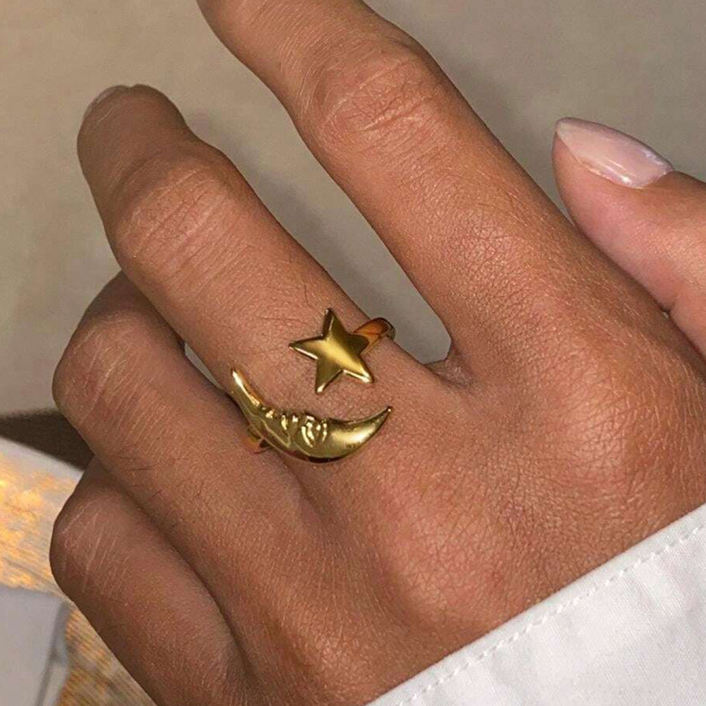 Stainless Steel High-End Women's Retro Star and Moon Opening Adjustable Ring Personalized Niche Hot-Selling Hand Jewelry