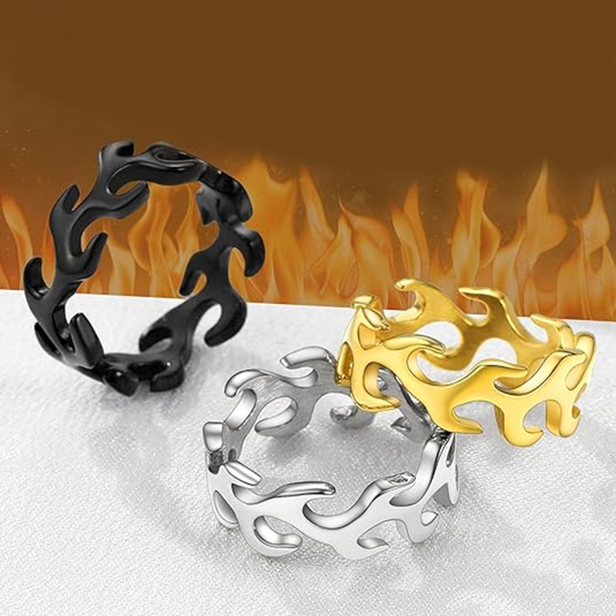 Creative Hip-Hop Burning Flame Ring Waterproof Silver Gold Black Stainless Steel Ring Jewelry for Men and Women
