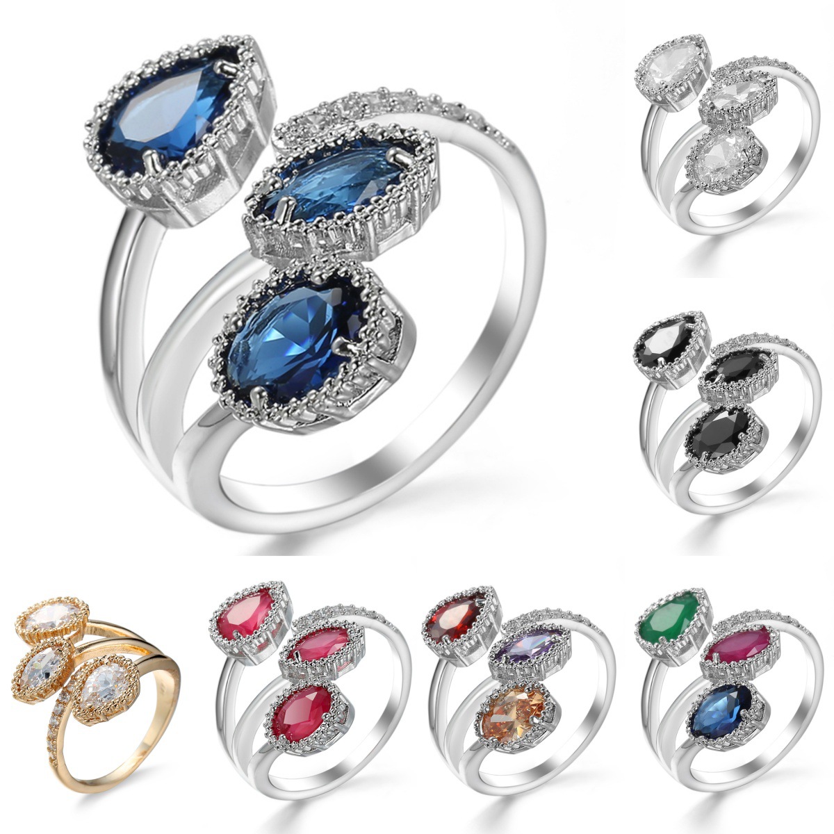 Cross-Border Aliexpress Hot-Selling Jewelry Ring Wholesale Fashion Hand Jewelry Water Drop Sapphire Blue Zircon Open Copper Ring for Women