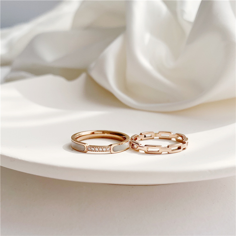 Japanese and Korean Style Simple and Fashionable White Shell Fritillary Diamond-encrusted Titanium Steel Rose-plated Gold Combination Index Finger Ring for Women